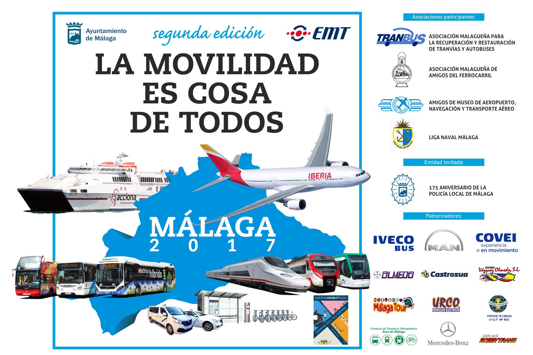 Pero no sólo nosotros tuvimos el placer de colaborar en el acto, estuvimos acompañados de otras asociaciones como Tran-Bus, La Liga Naval de Málaga y los Amigos del Museo del Aeropuerto. Además, contamos con la colaboración del Ayuntamiento de Málaga y la EMT.